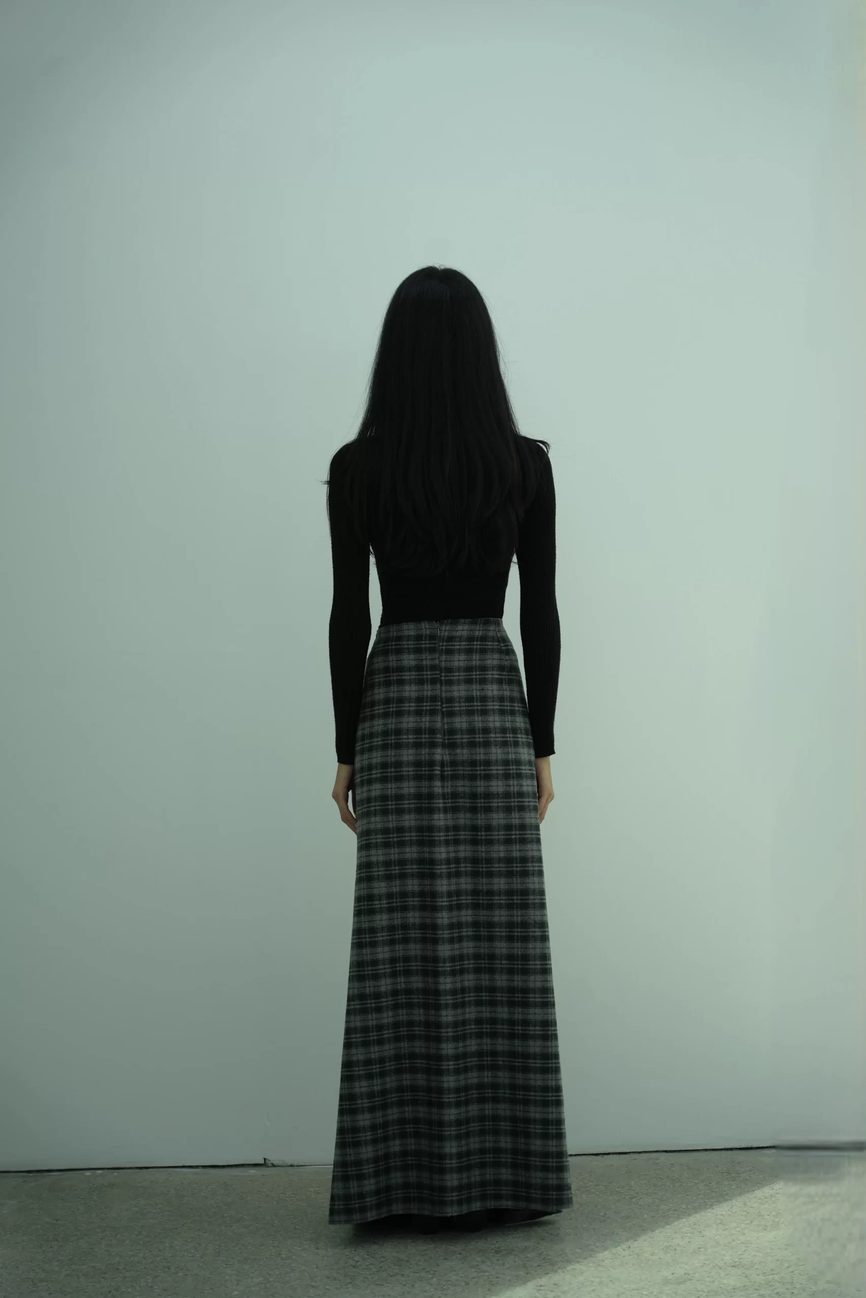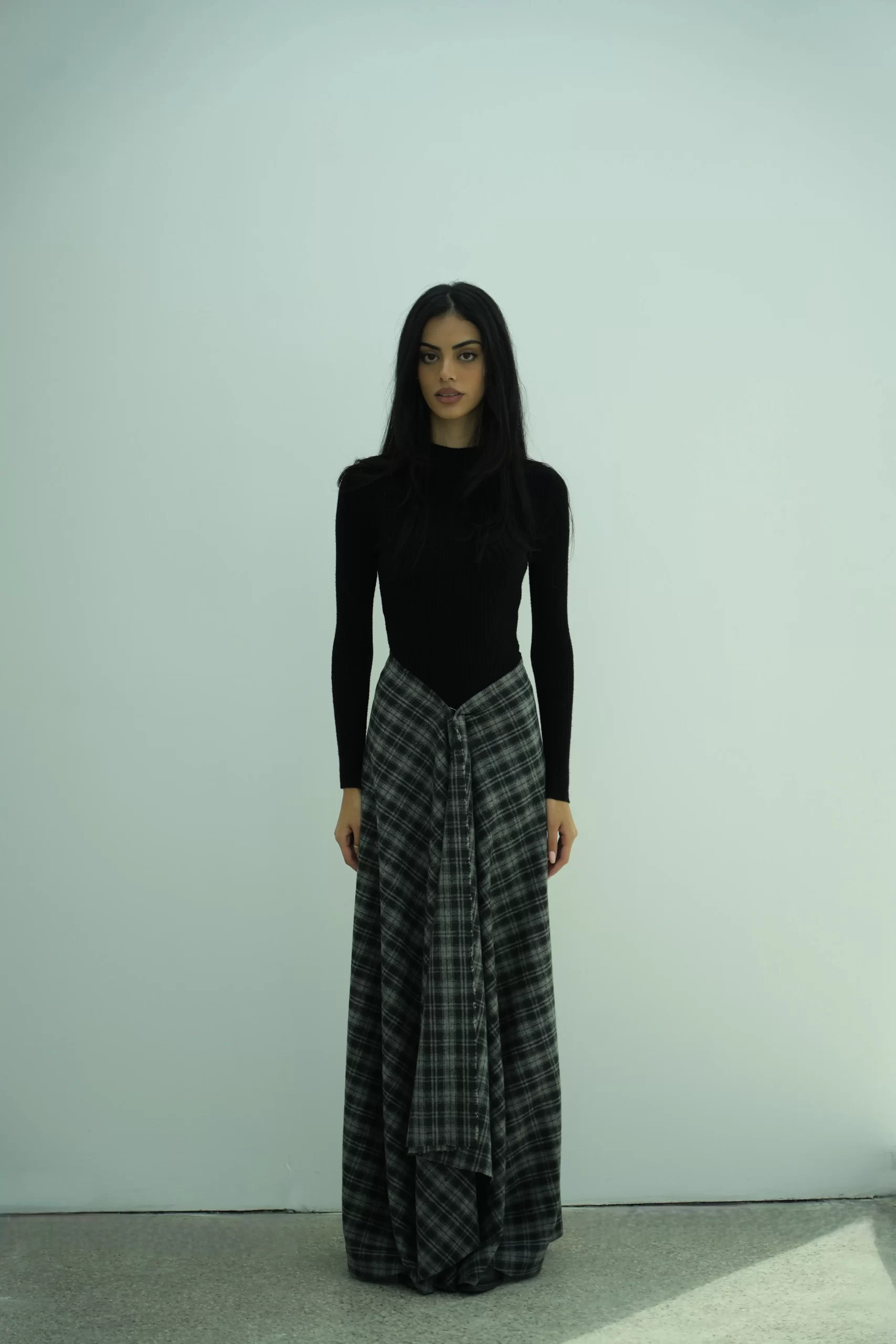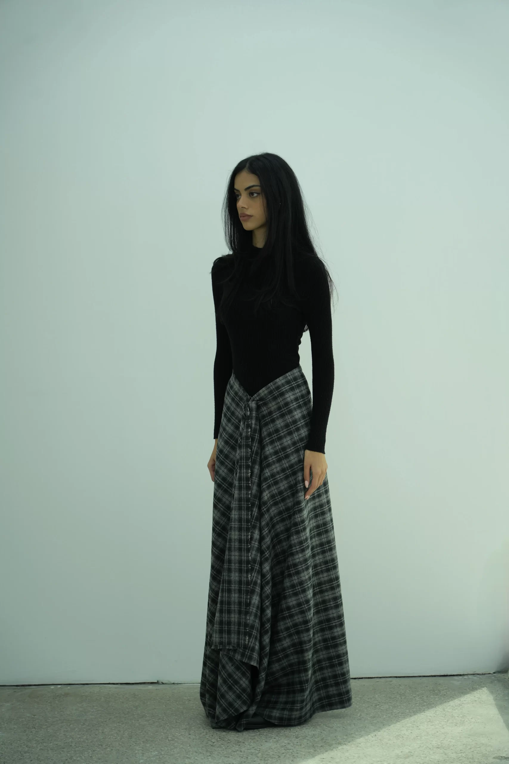 A full-length plaid skirt with a soft, voluminous drape and a sculpted V-shaped waistband. Designed with front gathers that create movement and flow, this skirt offers an elegant, elongated silhouette in plaid fabric.