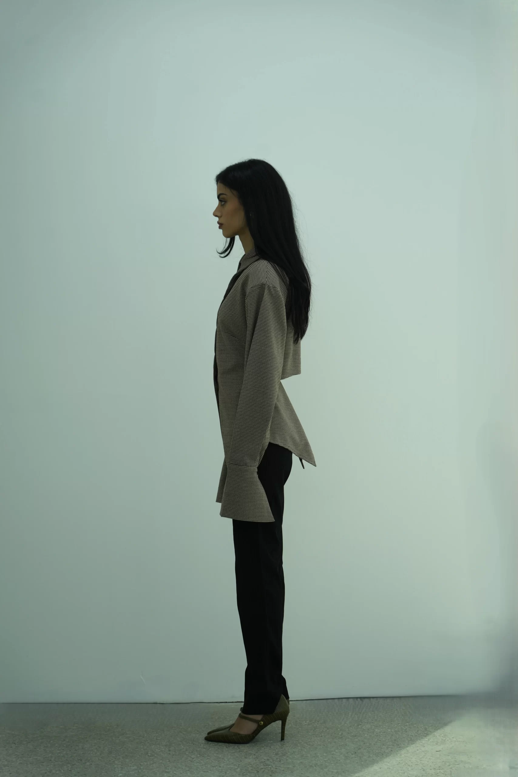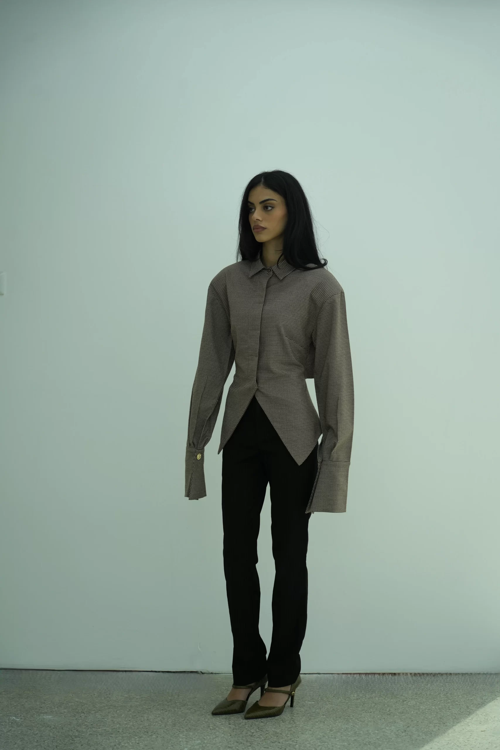 The Sola Shirt is crafted from a structured houndstooth fabric and designed with padded shoulders for a sharp, elevated silhouette, complete with an asymmetric hemline, extended cuffs and adjustable waist.